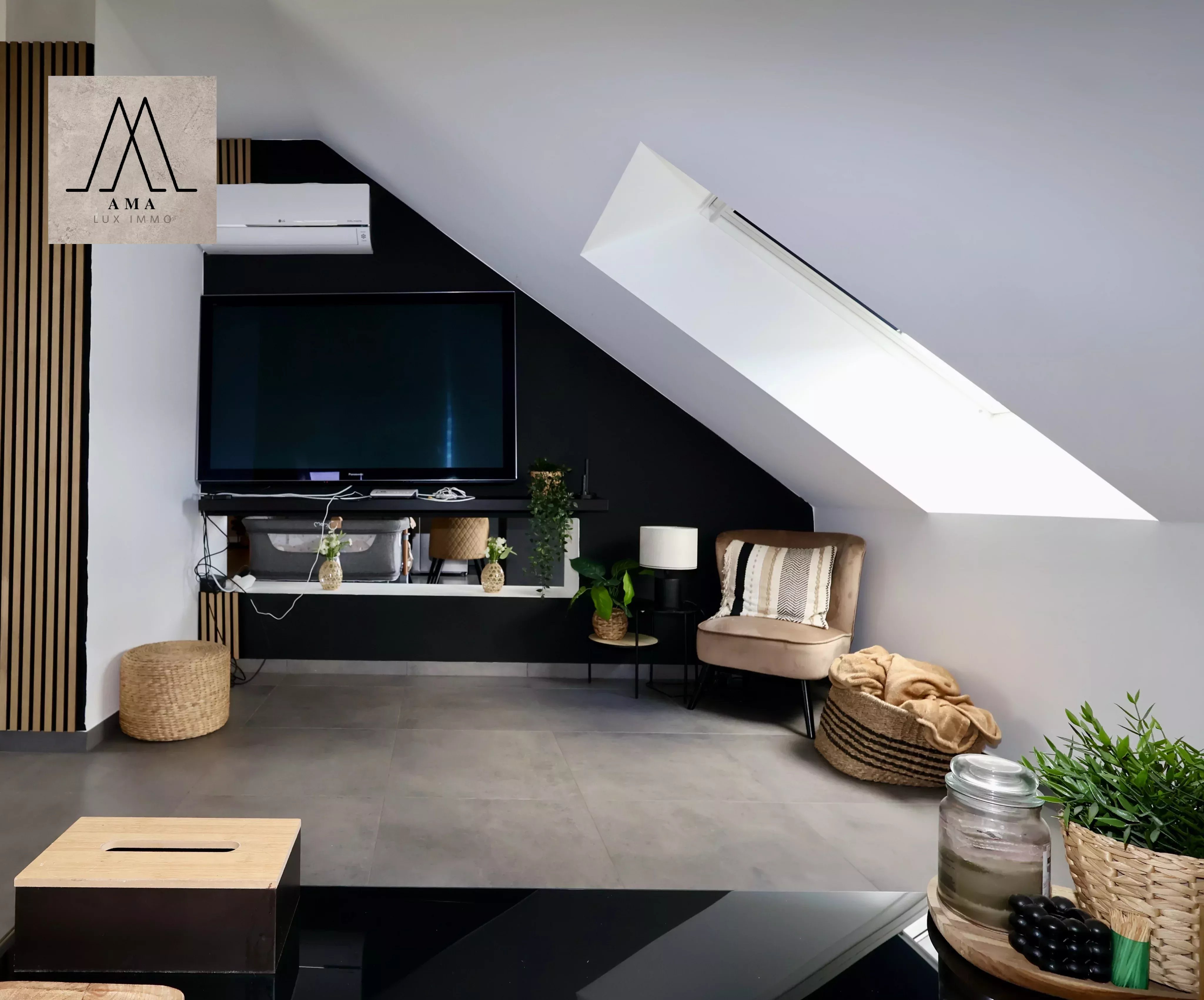- Le salon, vaste et baigné de lumière grâce aux nombreux velux, est l’endroit parfait pour se relaxer ou recevoir des invités. Sa disposition ouverte permet un visuel avec les autres pièces