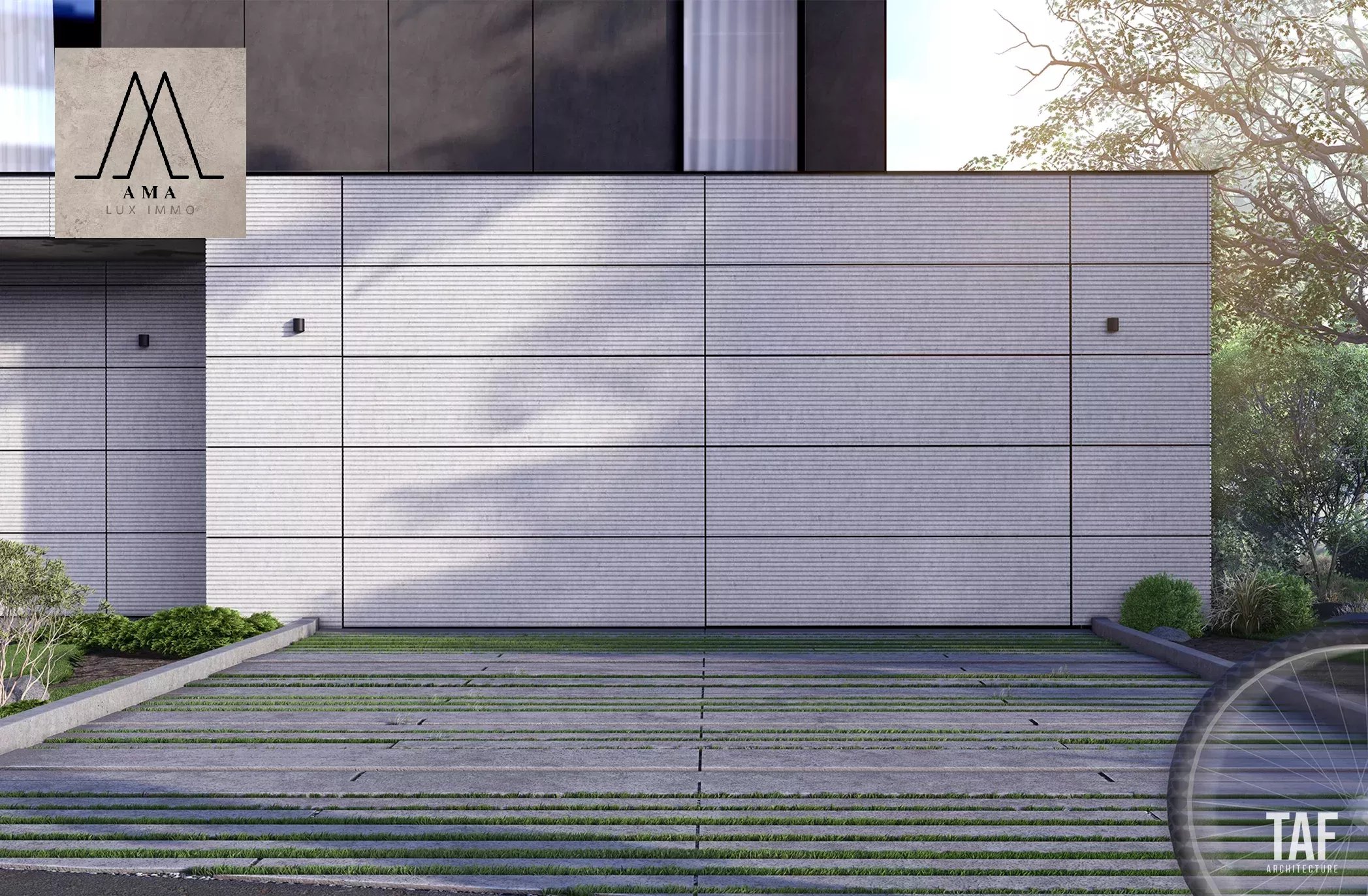 - Garage pour deux voitures (côte à côte) avec porte motorisée par un moteur industriel pouvant supporter le poids du revêtement de la façade + deux prises pour véhicules électriques