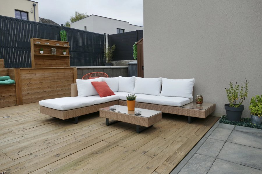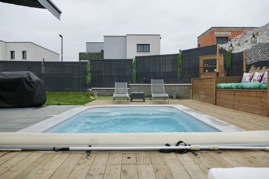 Ce bel espace de vie vous amène via de larges baies vitrées vers l'espace extérieur composé d'une large terrasse de +- 22 m2 couverte par une marquise à commande électrique, une piscine chauffée (4/2,5m) ainsi qu'un jardin aménagé exposé sud-est qui vous permettra d'installer vos invités confortablement et à l'abris des regards.